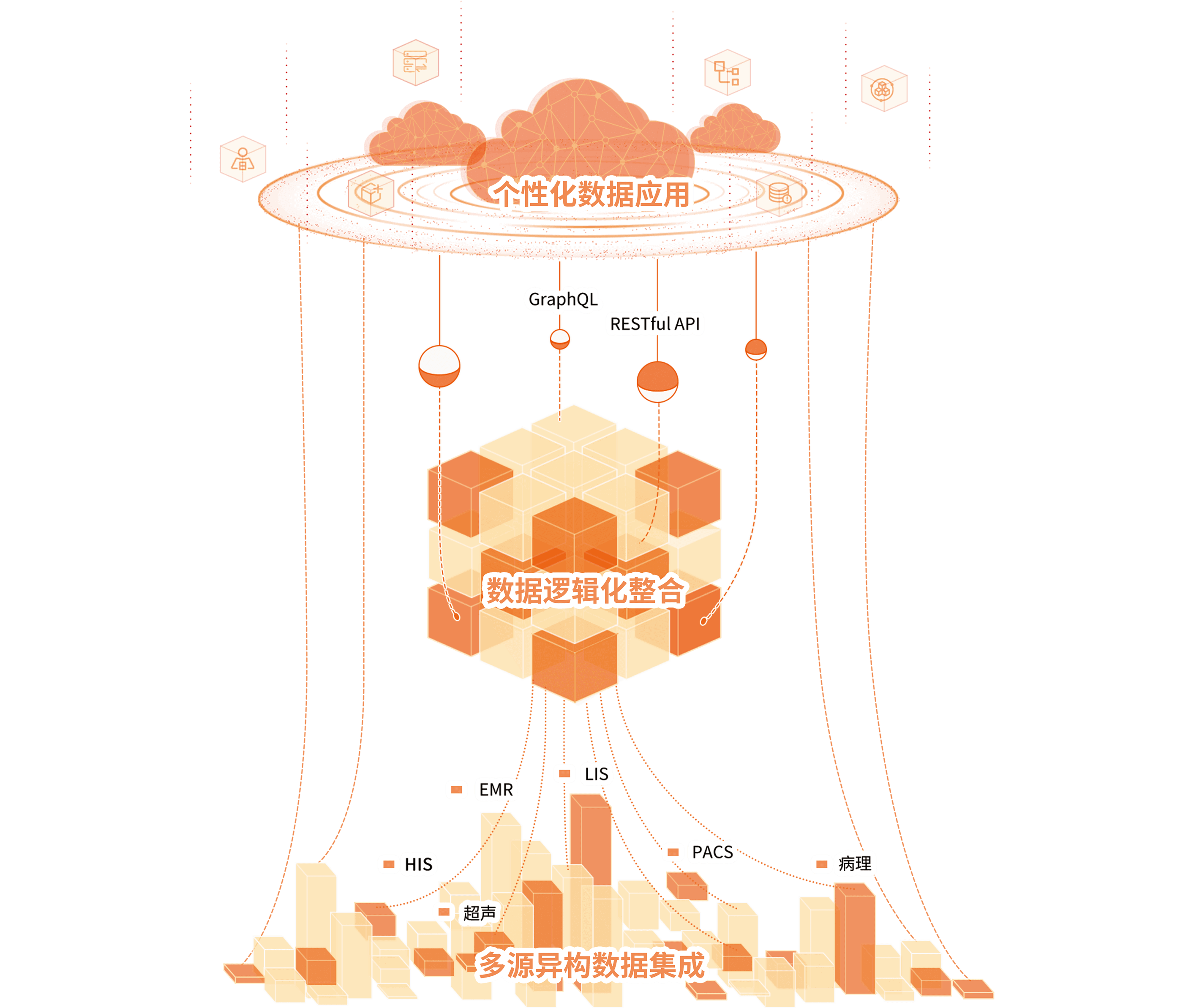 醫(yī)眾醫(yī)療數(shù)據(jù)服務(wù)采用 Data Fabric 數(shù)據(jù)編織的架構(gòu)理念,幫助用戶應(yīng)對在數(shù)據(jù)資產(chǎn)化進程中產(chǎn)生的復(fù)雜性、分布式、多元化等因素,從單純的以數(shù)據(jù)應(yīng)用為核心建設(shè)數(shù)字化,向體系化的數(shù)據(jù)服務(wù)能力建設(shè)轉(zhuǎn)型。